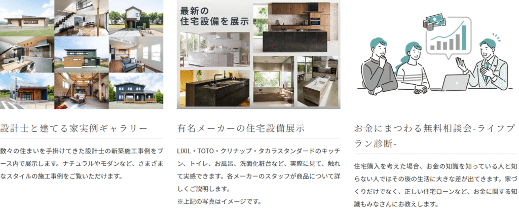 理想の家づくりを考えている方、リフォームを検討中の方、不動産情報を知りたい方まで、住まいに関するあらゆる疑問をプロに直接相談できます。また、はたらくクルマの展示もあり、ご家族みんなで楽しめます!!家づくりのヒントを見つけながら、ご家族みんなで充実した一日をお過ごしください。
