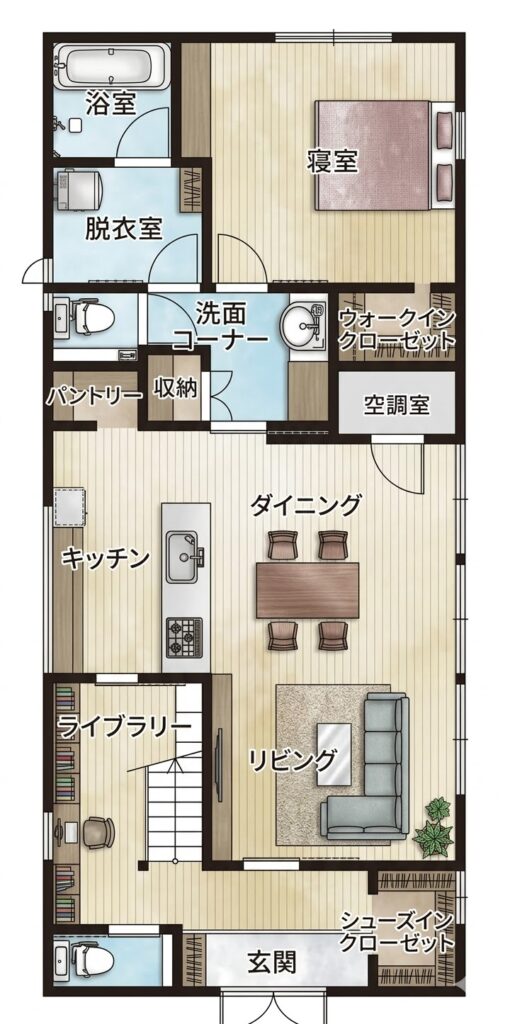 寝室を1階へ配置することで、毎日の昇り降りが不要に。家事動線もスムーズになり、ライフスタイルに合わせた理想の住環境が整います。