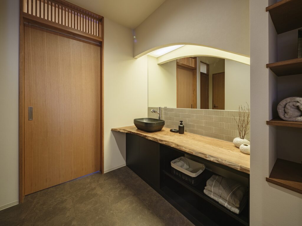 他にも木の質感を楽しめるキッチンや、帰るたびに気持ちが安らぐエントランス、天然木の一枚板を使った造作洗面台など見どころいっぱいの「安曇川モデルハウス」。