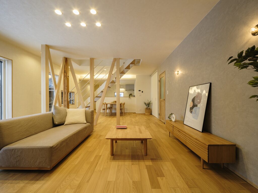 リビングの中心には、デザインの一部として溶け込む鉄骨階段を配置。木目の質感を活かしたナチュラルな内装で統一し、自然光が差し込む明るく開放的な空間が完成!