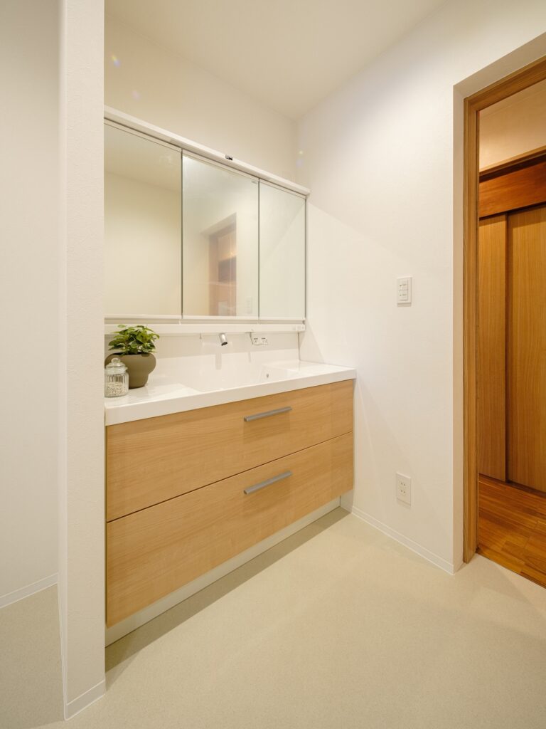 幅1200mmのゆとりある洗面カウンターを採用し、身支度や家事が快適に行えるように設計。ホテルライクなデザインと収納力を兼ね備えた、明るく清潔感のある洗面スペースに。