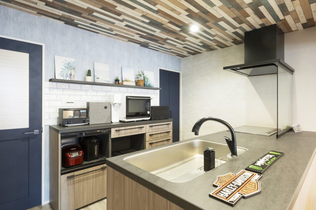 ネイビーの建具×木目×白タイルを組み合わせ、アメリカ西海岸の爽やかな空気感に包まれるキッチンへ。古民家の重厚感を感じさせない軽やかさが魅力で、家事をしながら気分が上がるデザインに仕上がった。