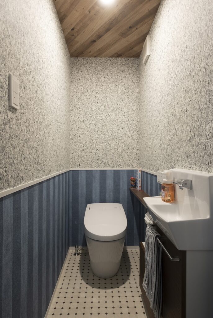 ウォーリーを探せとストライプの壁紙、斜め張りの木目天井、柄の床材。バラバラに見えて、驚くほどバランスよくまとまった“センスが光る”トイレ。N様ご夫婦の世界観が最も詰まった空間のひとつ。