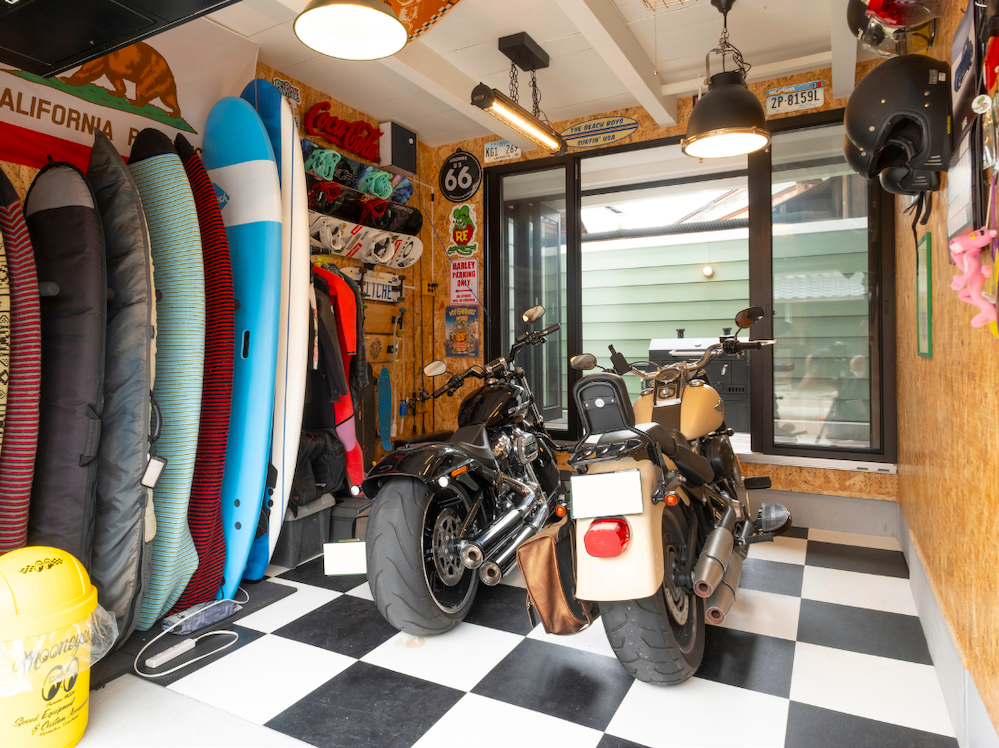ご夫婦の“好き”を詰め込んだ趣味室は、照明をひとつずつ変えたり、天井を塗装したりと、遊び心を存分に詰め込んだ。中庭に面したオリーブグリーンの塀もアクセントとなり、ご夫婦のライフスタイルを象徴する特別な空間となった。※バイクは撮影用にセット。