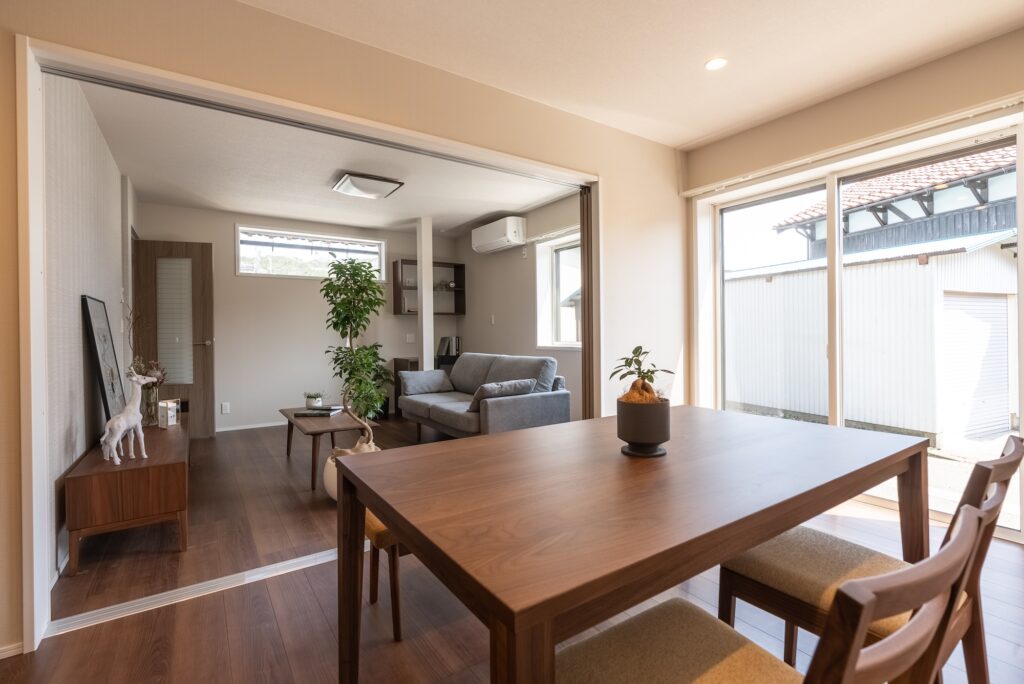 数十年にわたり、民宿として活用してきた建物を、住まいへと再生したA様邸のリノベーション。細かく区切られていた既存の壁を取り払い、無駄な廊下をなくす大胆なプランをご提案し、LDKと寝室・洗面室を回遊できる動線を確保することで、家全体にゆとりとつながりが生まれる住まいへと生まれ変わった。