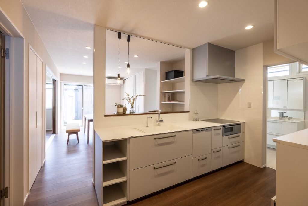特注キッチンに造作棚を組み合わせ、収納力と作業性の両立した対面式キッチンを設置。回遊動線の中心となり、家族が自然と集まる場所に。