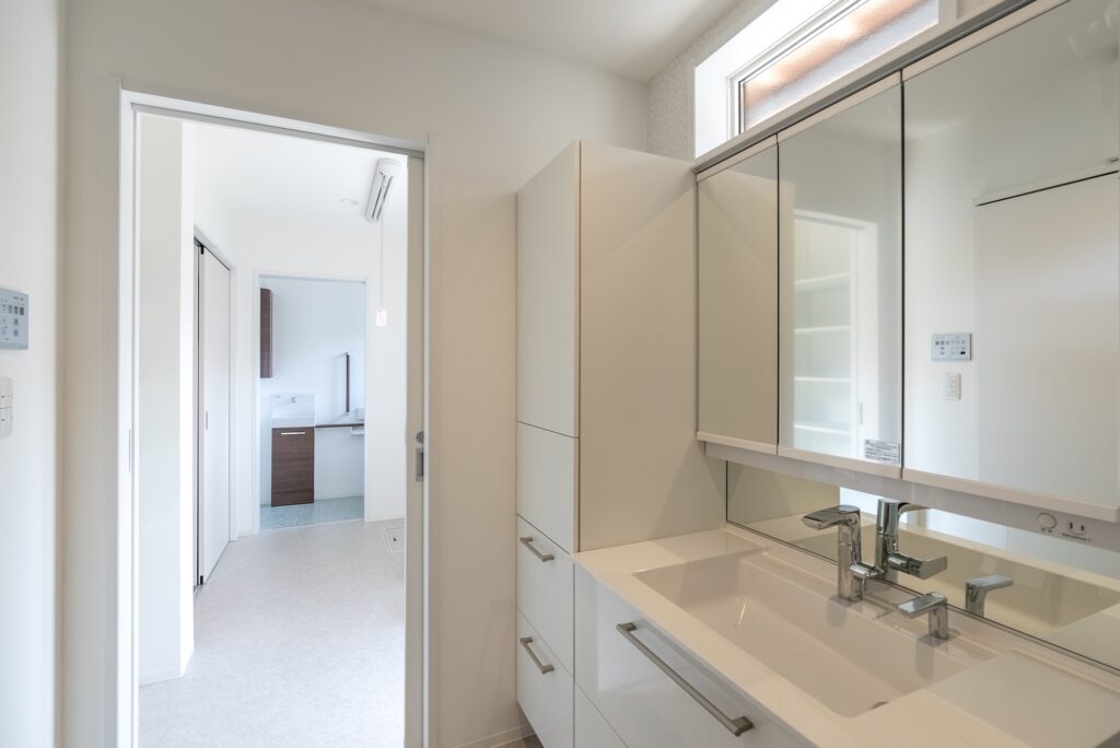洗面所とランドリースペースを分けたことで、忙しい朝でも渋滞が起こらず、スムーズに身支度ができるように。