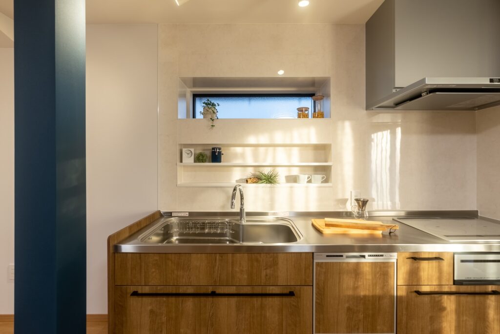 光が差し込むキッチン。飾り棚に好きなアイテムを飾れる「見える収納」を取り入れ、心が弾むキッチン空間に。広々とした作業スペースと柔らかな色味の内装が、毎日の家事をより快適にしてくれる。