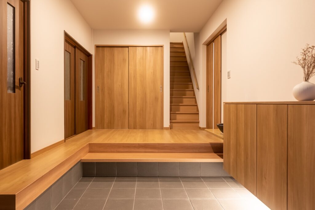 木の温もりが迎える玄関。広く開放感がありながら、閑散としないバランスを意識し、木目の統一感で温かく仕上げた玄関。家族の「ただいま」が自然と似合う、やさしい佇まいが完成した。